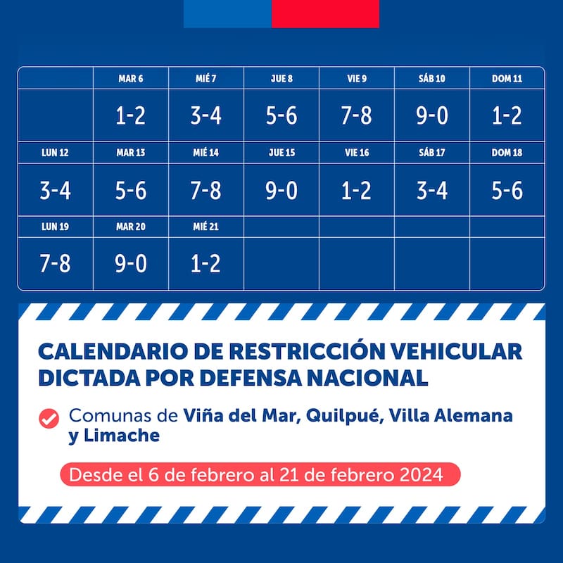 En ese sentido, la Armada señaló que a contar de hoy (10 de febrero) hasta el miércoles 14 de febrero, desde las 5 de la mañana y hasta las 17 horas de la tarde, los vehículos particulares no podrán ir ciertas zonas de afectación, en las comunas de Quilpué y Viña del Mar.