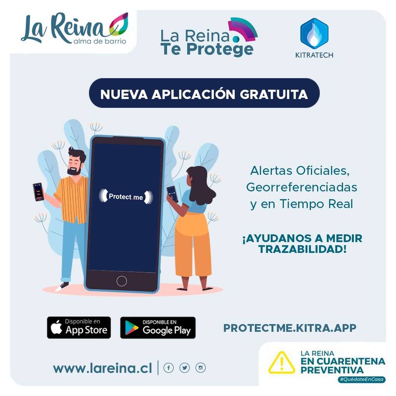 “ProtectMe”. Ese es el nombre de la nueva aplicación gratuita que lanzó este sábado el municipio de La Reina y que, entre otras cosas, ayudará a medir la trazabilidad de casos Covid-19 en la comuna que -la semana pasada- avanzó a la etapa de Transición en el Plan Paso a Paso del Ministerio de Salud.