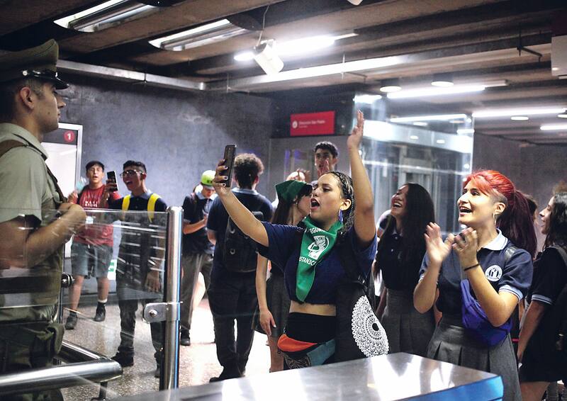 Al mediodía, la protesta en la Alameda se repitió, cuando los jóvenes intentaron infructuosamente hacer una “evasión masiva” en la Estación Universidad de Chile.