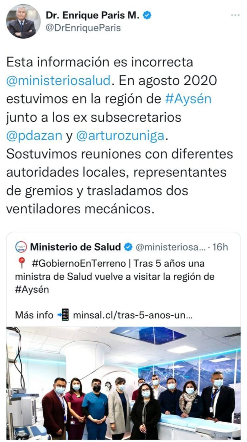 La publicación en la red social de Elon Musk generó de inmediato la crítica del exministro de Salud Enrique Paris, que afirmó que la información divulgada era “incorrecta” y recordó que él estuvo en la región en agosto de 2020 junto a su dupla de subsecretarios, Paula Daza y Arturo Zúñiga.