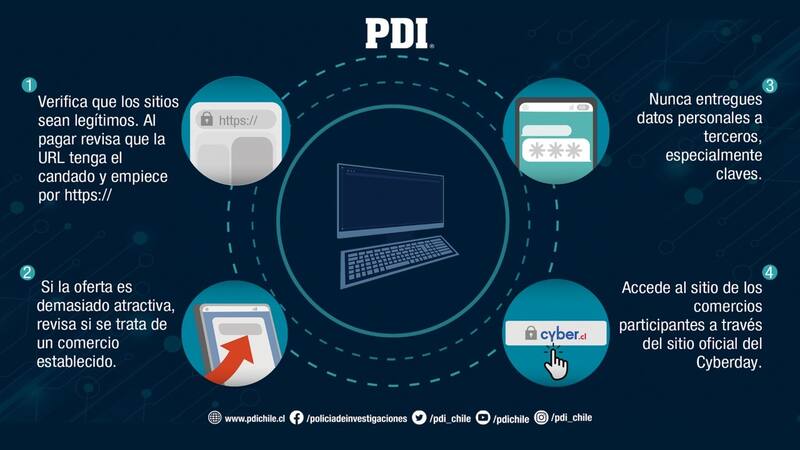 Bajo ese escenario, desde la PDI entregaron recomendaciones y consejos para evitar ser víctima de ese tipo de delitos, en el marco del Cyber Monday.