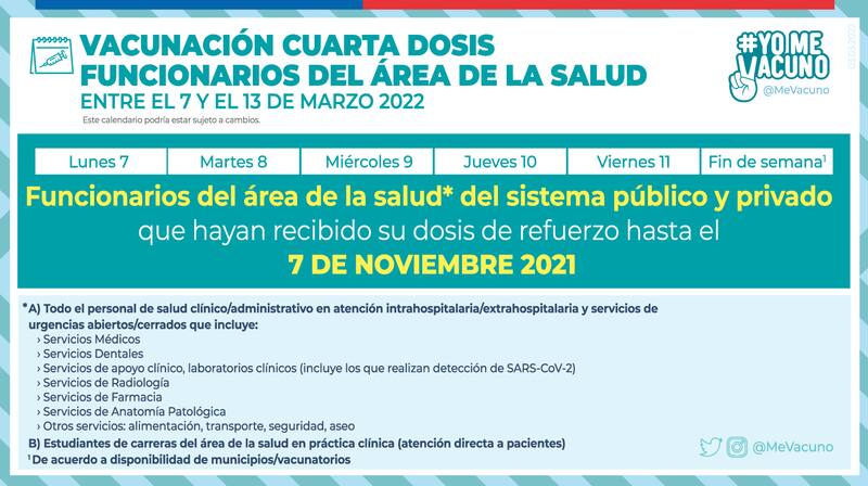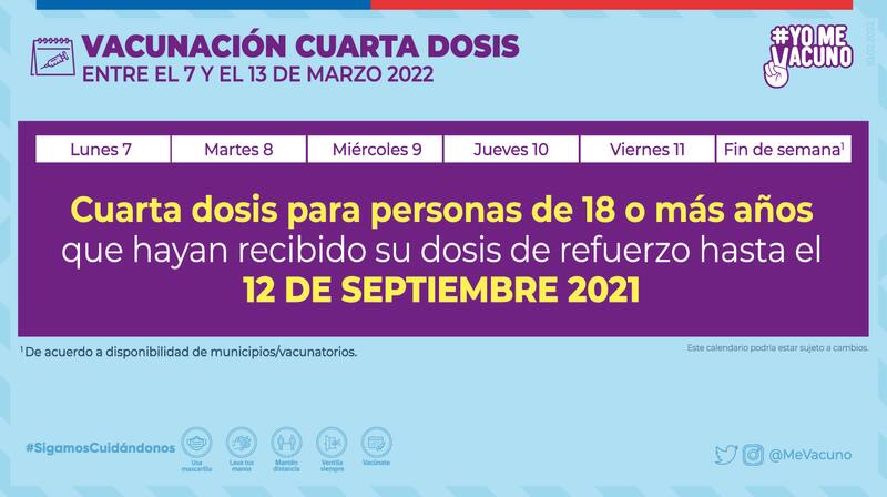 Al igual que en las etapas de inoculación pasadas, el Minsal precisó quiénes podrán acceder a la cuarta dosis de vacuna contra el Covid-19, que en este período se concentra en personas de 18 años o más, personal de salud y personas inmunocomprometidas.
