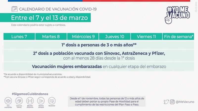 Para las personas que requieran su segunda inoculación deben esperar al menos 28 días desde la aplicación de la primera dosis de Sinovac, AstraZeneca y Pfizer. También se mantendrá la vacunación para los menores de edad de tres años o más y de las mujeres embarazas sin importan en qué etapa de embarazo estén.