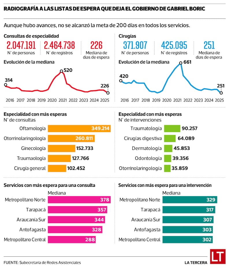 Uno de los flancos más relevantes en salud siguen siendo las listas de espera. Si bien a través de diversas medidas se han logrado reducir los tiempos, no se cumplió la meta de alcanzar a nivel nacional una mediana de 200 días de espera, existiendo incluso servicios donde esta se acerca hasta casi un año.