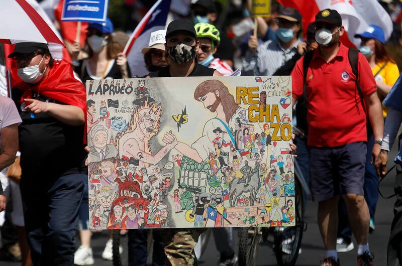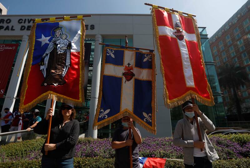 Uno de los lienzos consignó la frase “Rechazo la Constitución de Piñera”, mientras otros incluían imágenes religiosas y llamados a votar “nulo” en la elección del domingo.
