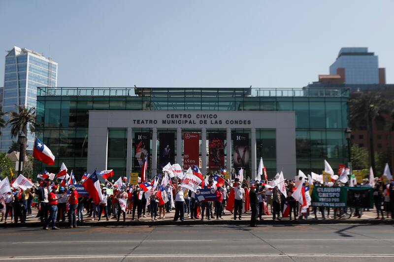 Los manifestantes se movilizaron por la Avenida Apoquindo y desplegaron pancartas y cánticos en las afueras de la estación de Metro El Golf, donde se ubica el Teatro Municipal de Las Condes, entre banderas chilenas y consignas contra la izquierda.