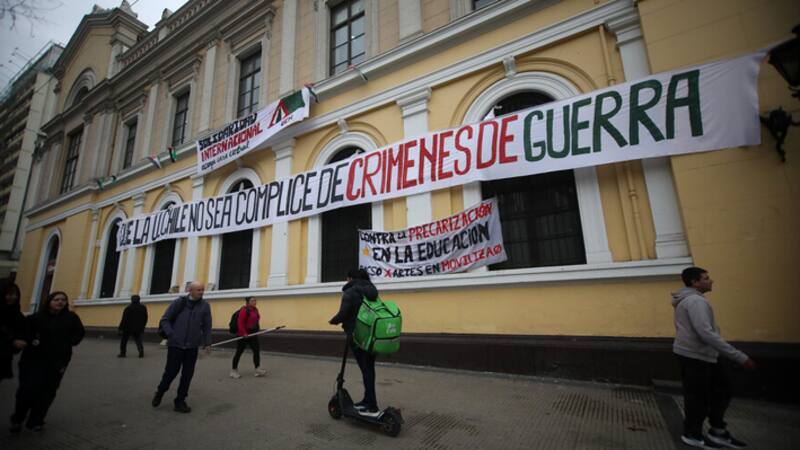 La mañana de este jueves, el frontis de la Casa Central de la Universidad de Chile apareció sin los lienzos propalestina instalados hace un mes por un grupo de estudiantes que se manifiestan en contra de las acciones bélicas de Israel en la Franja de Gaza.