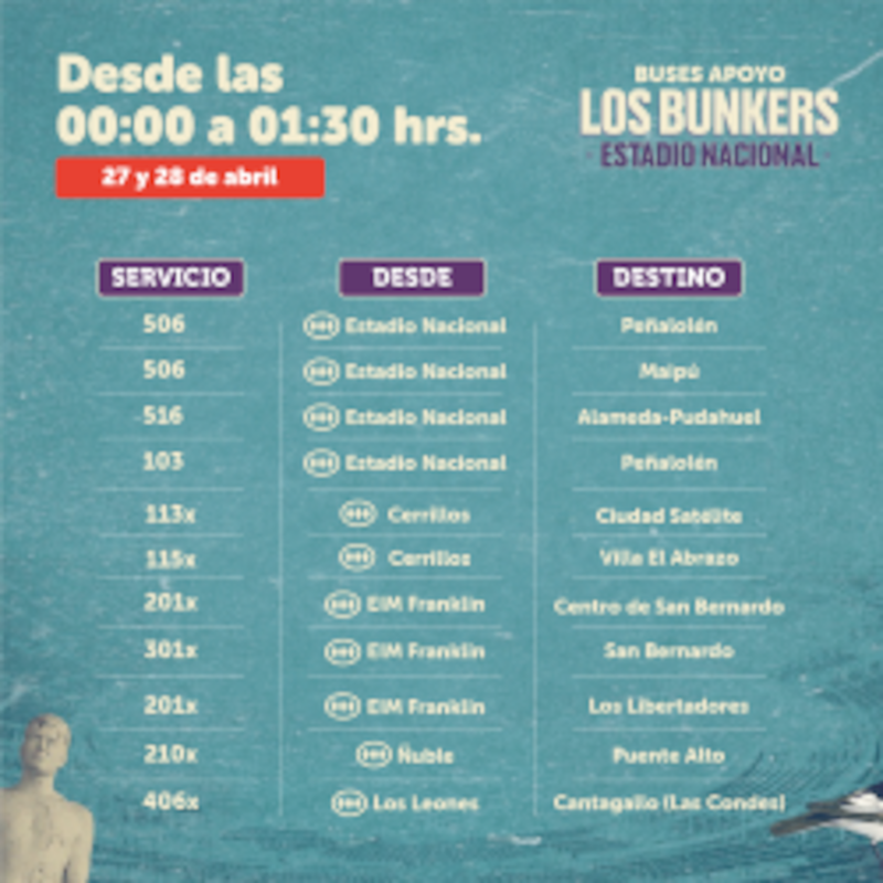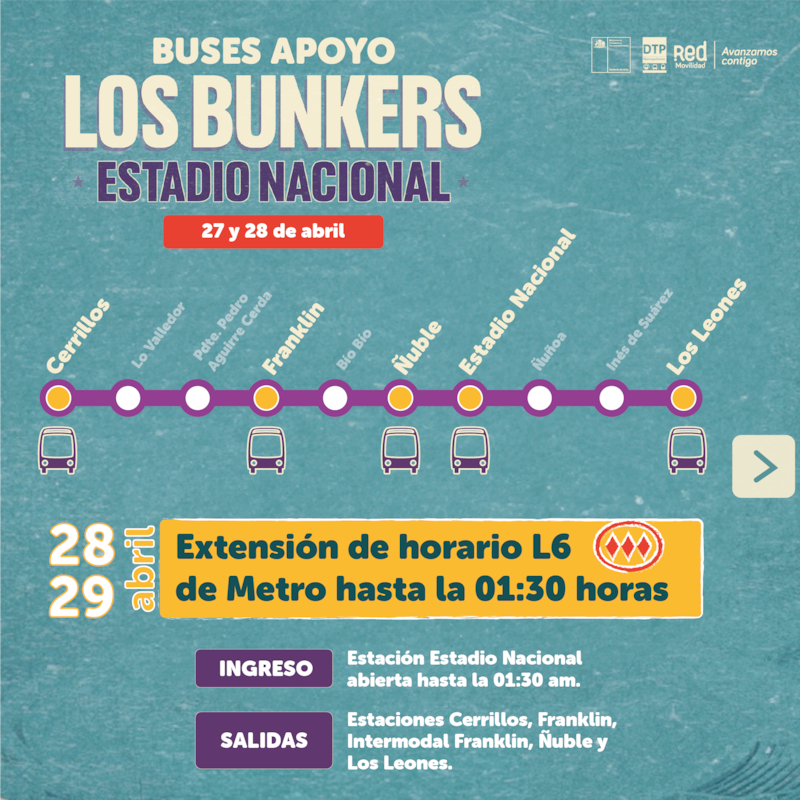 Este sábado 27 y domingo 28 de abril se realizarán los conciertos de la banda de rock nacional Los Bunkers en el Estadio Nacional. Bajo ese contexto, desde el Directorio de Transporte Público Metropolitano (DTPM) y Metro de Santiago anunciaron medidas extraordinarias que se implementarán para esas jornadas.