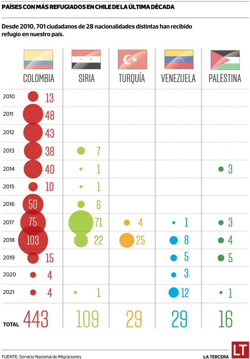 Según datos del Servicio Nacional de Migraciones, 701 de las 21.847 peticiones de refugio han sido aceptadas en la última década. Los colombianos son los que más han conseguido esta condición (443), seguidos por los sirios (109), mientras que los venezolanos es la nacionalidad que más rechazos ha obtenido. Expertos advierten que la baja cantidad de aprobaciones tendría relación con un mal funcionamiento del procedimiento de asilo.