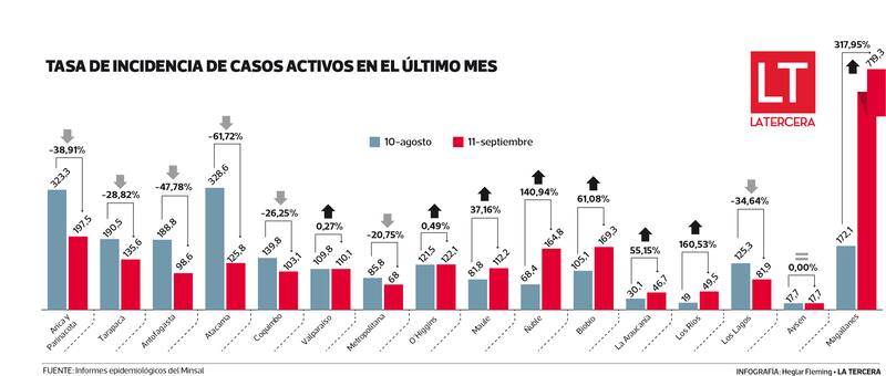Hay dos excepciones: Los Lagos, que hace un mes venía de un fuerte brote en Puerto Montt, bajó sus casos activos en 34,64%. Y Aysén se mantuvo exactamente en la misma tasa, sin variaciones, pero eso cambiará en el próximo informe, dado que en los tres últimos días -que no estaban contemplados en el epidemiológico del sábado pasado- se acumularon 32 casos, casi el 20% de todos los registrados en la región desde marzo.