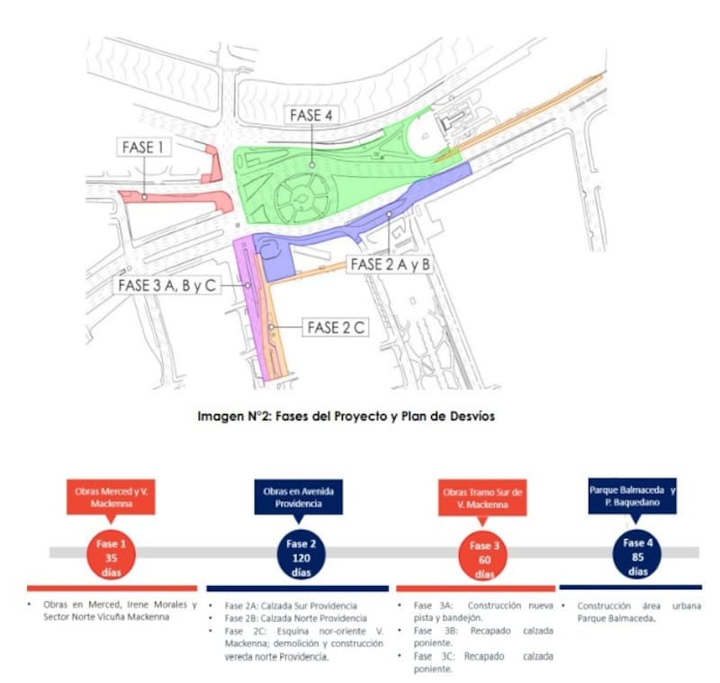En los antecedentes de la licitación, donde se advierte primeramente al contratista que “dado el emplazamiento del proyecto, las obras preliminares deben considerar los riesgos conocidos de la zona, relacionados con imprevistos producto de manifestaciones masivas, no siempre programadas”, se detalla también que el proyecto contará con cuatro fases, cada una con un objetivo y duración distintos.