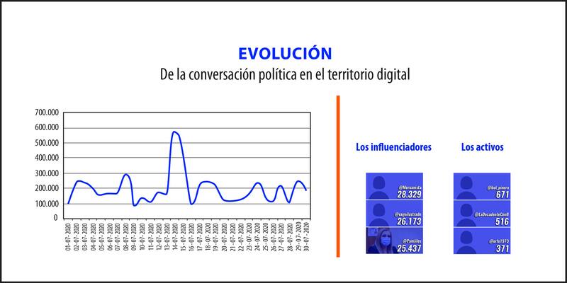 Uno de los primeros hitos en la evolución de la conversación política digital fue el miércoles 8 de julio, cuando se aprobó la idea de legislar el retiro de ahorros desde las AFPs. Sn embargo, el peak fue durante el 14 y 15 de julio. La razón fue el ingreso e inicio en la discusión en la Cámara de Diputados al proyecto que permite retirar el 10% de los fondos previsionales. En tanto, el segundo día tuvo una alta mención debido a la aprobación de esta reforma.