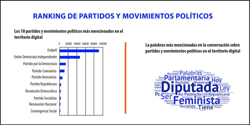 En el ranking de partidos y movimientos políticos encabeza el listado Evópoli. ¿A qué se debe que la tercera fuerza política del oficialismo alcance este nivel de menciones? “Los liderazgos ministeriales que más se expusieron mediáticamente fueron Evópoli. Ese capital simbólico que representaba Blumel y Briones se trasladó al partido. A esto se suma que Evópoli había anunciado la intención de reconsiderar la postura partidista con respecto al apruebo al rechazo”, analiza Nicolás Freire. En segundo lugar, está la UDI que llamó la atención en la red por su extremo rechazo al retiro del 10% y por la decisión del gremialismo de pasar al tribunal supremo del partido a los parlamentarios que votaron a favor de este proyecto.