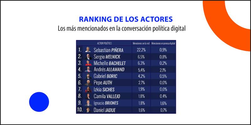 En el ranking de los actores más mencionados en la conversación digital lideran Sebastián Piñera, Sergio Melnick, Michelle Bachelet, Andrés Allamand, Gabriel Boric, Pepe Auth, Izkia Siches, Camila Vallejo, Ignacio Briones y Daniel Jadue.