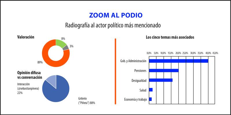 El 89% de los tuits que aluden a Piñera son negativos, haciendo referencia a temas como el manejo frente a la pandemia, la falta de apoyo a la clase media y las posibilidades de veto al retiro de los fondos previsionales. Solo el 8% son comentarios positivos, haciendo mención a la baja de casos positivos de COVID-19 y la reapertura de algunas ciudades.