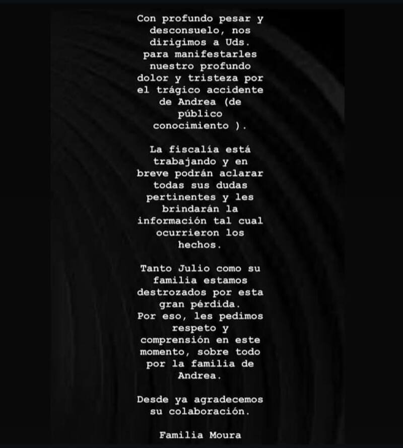 Petit decidió no arrestar a Moura, sin embargo, la justicia abrió una causa de “averiguación por causa de muerte”, en ese sentido el músico tendría una declaración que lo beneficiaría por parte de su exesposa, quien declaró a la policía que “él nunca fue violento con ella”.