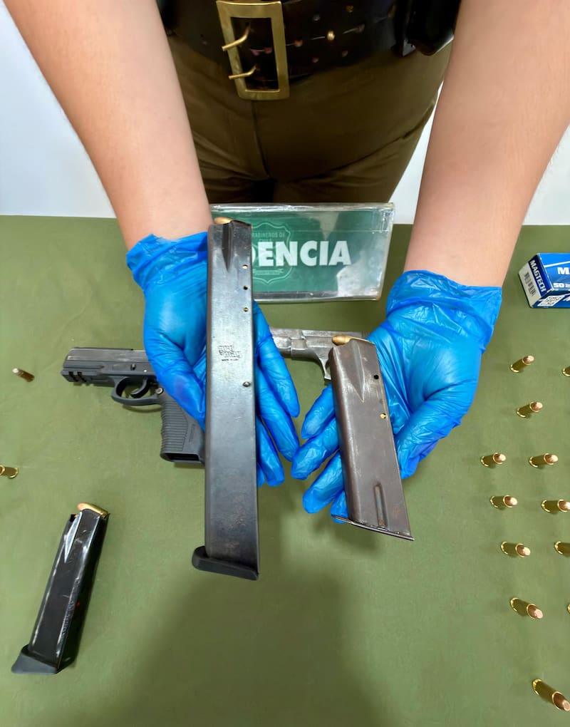 En detalle, Carabineros informó que se hallaron una pistola marca Taurus calibre .40; una pistola marca FAMAE calibre 9 mm; 32 cartuchos calibre 9mm marca Luger; 44 cartuchos calibre .40 marca S&W; tres cartuchos calibre .22 marca GECO; cartuchos calibre .38 marca SP; seis cartuchos calibre 9mm distintas marcas; dos cargadores de pistola; un cargador de UZI y 1,7 kilogramos de cocaína base.