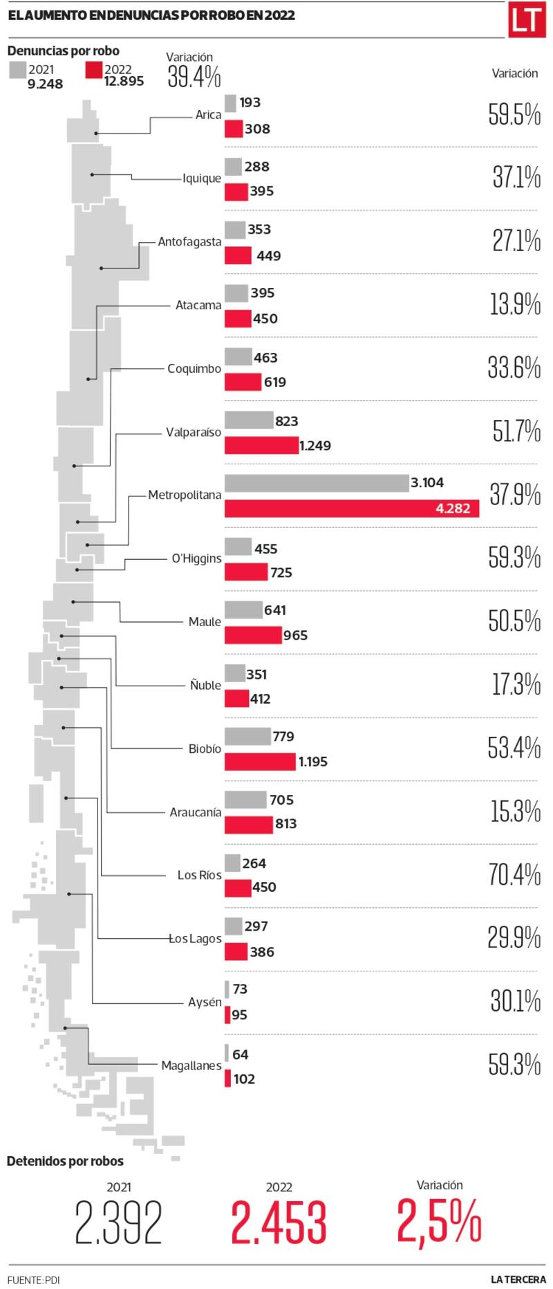 Si bien todas las regiones del país vieron subir sus cifras de denuncias de robos, Los Ríos fue donde más creció, registrando un 70% más respecto del año anterior, seguida de Arica (59,5%), O’Higgins (59,3%) y Magallanes (59,3%). En la Región Metropolitana, que concentra por lejos el mayor número de estas denuncias (4.282), el aumento fue de 37,9% versus el año pasado. Más atrás en número se ubican las regiones de Valparaíso (1.249) y Biobío (1.195) (ver infografía).