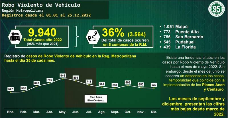 De acuerdo a la policía, existe una tendencia al alza en los casos de robos violentos de vehículos hasta mayo, pero desde junio “se observa un descenso en los casos, temporalidad que coincide con la implementación de los planes Anen y Centauro”.