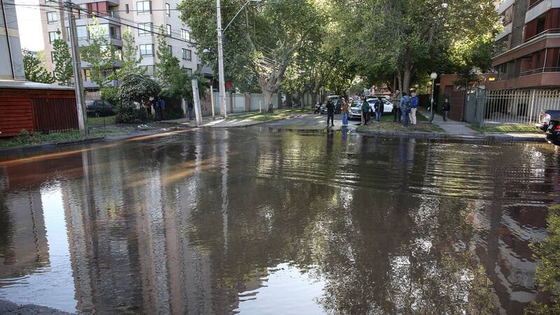 Una inundación se registra en la comuna de Ñuñoa por una rotura de cañería de agua. En concreto, en el tramo final de calle Palqui, cerca de Exequiel Fernández, zona que se encuentra totalmente inundada por el agua.