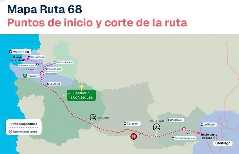 En ese contexto, el MOP dispuso un plan de contingencia para mitigar los estragos que pueda causar el aumento del flujo vehicular y el corte total de la Ruta 68.
