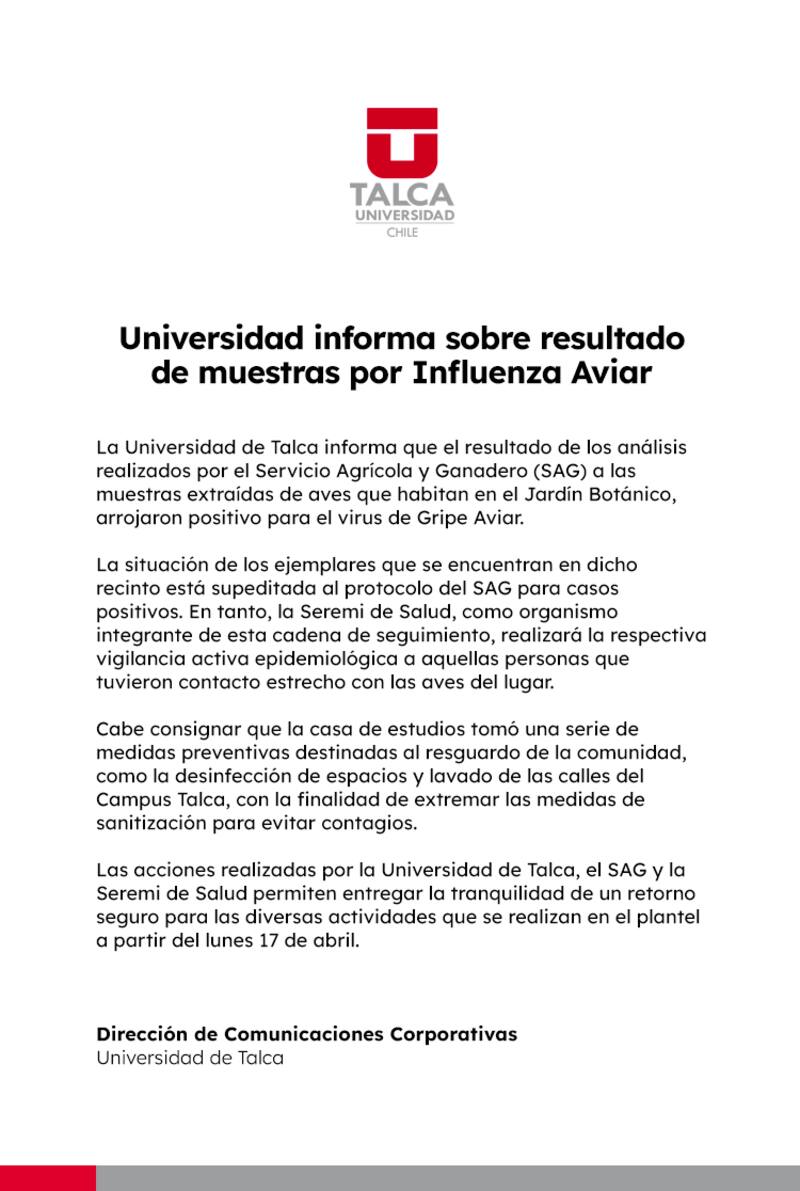 A través de un comunicado, la casa de estudios maulina dio a conocer que “la situación de los ejemplares que se encuentran en dicho recinto está supeditada al protocolo del SAG para casos positivos”. Y que la Seremi de Salud, como organismo integrante de esta cadena de seguimiento, “realizará la respectiva vigilancia activa epidemiológica a aquellas personas que tuvieron contacto estrecho con las aves del lugar”.
