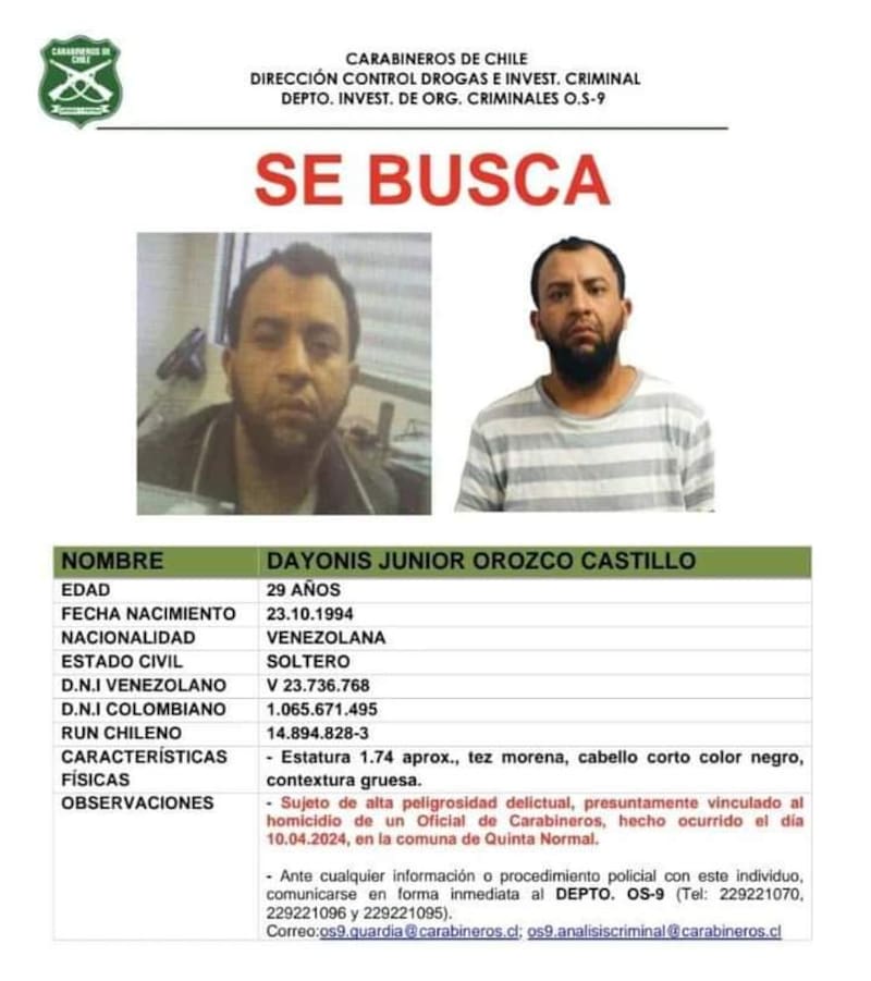 Carabineros se encuentra tras la pista de un sujeto venezolano que se mantiene en calidad de prófugo por el crimen del teniente Emmanuel Sánchez.