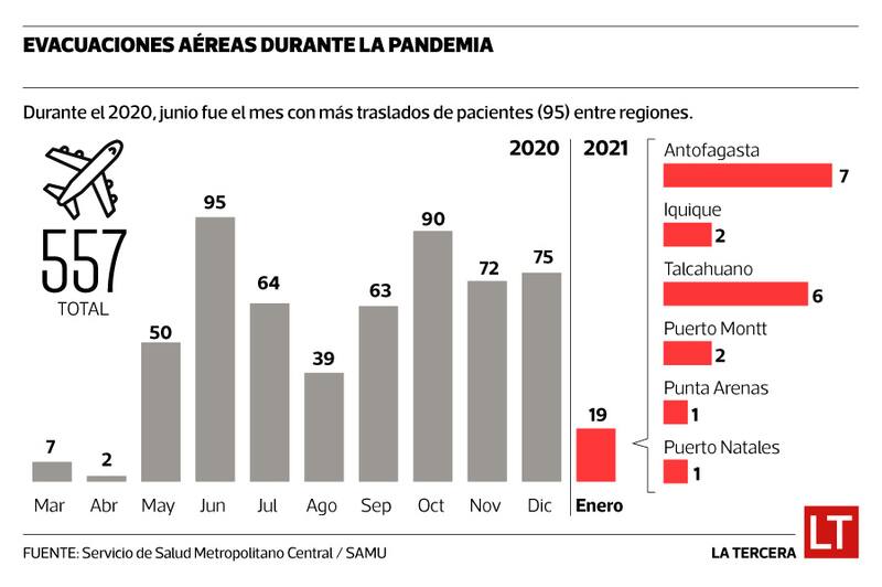 Sin embargo, y ante el alza de casos en las distintas regiones del país, a la fecha, y en lo que va de este mes, ya se registran 19 evacuaciones aéreas desde distintos puntos: Antofagasta, Talcahuano e Iquique son algunas de las zonas que ya han solicitado trasladar a sus pacientes debido una mayor demanda asistencial. En el sur, en tanto, también se ha notado una mayor demanda desde el Biobío.