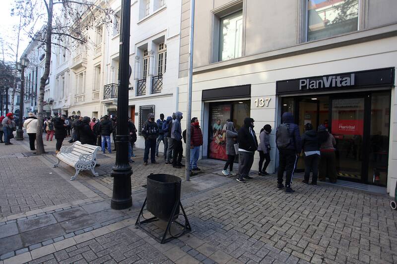 Una larga fila se registra esta mañana afuera de la AFP Plan Vital, ubicada en Agustinas con Tenderini, en la comuna de Santiago.