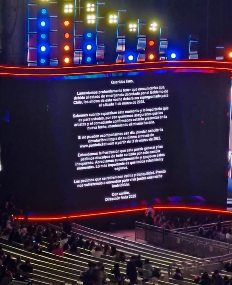 Desde la dirección del Festival de Viña del Mar, comunicaron a su asistentes que “los shows de esta noche deberá ser reprogramado para el sábado 1 de marzo de 2025″. Y agregaron que, “los artistas y el comediante confirmados estarán presentes en la nueva fecha, manteniendo el mismo horario”.