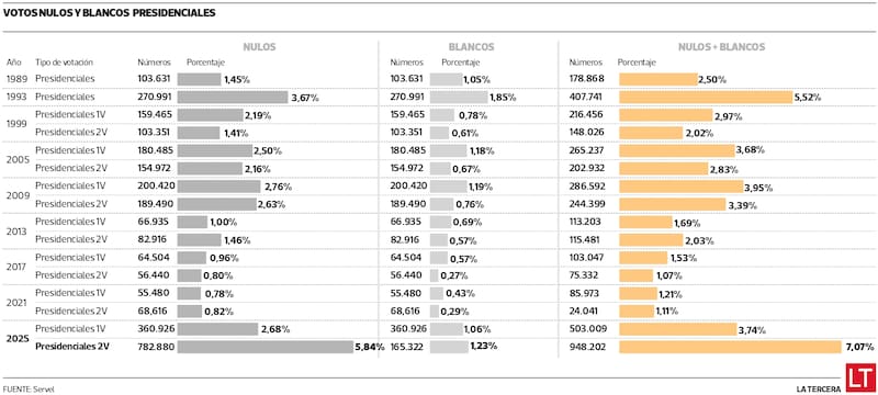 En total, según el último cómputo del Servicio Electoral (Servel), hubo 782.880 votos nulos, lo que representa 5,8% del total. Con esa estadística, este balotaje se convirtió en la elección presidencial con el mayor número de votos nulos desde el retorno a la democracia.
