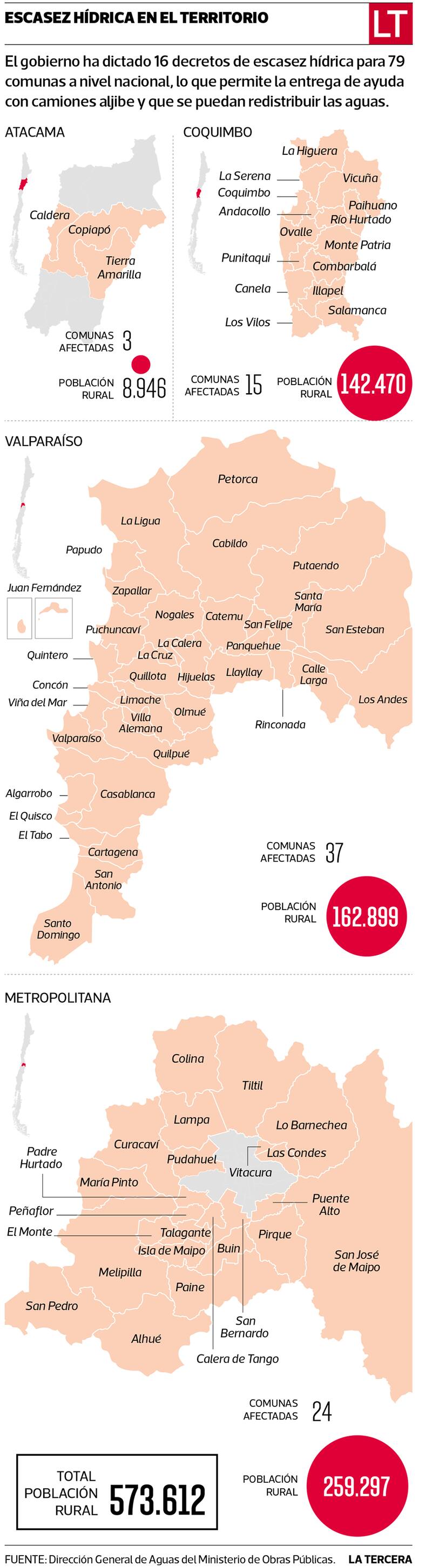Un total de 79 comunas, donde residen 573 mil personas, están actualmente bajo la categoría de “zona de escasez hídrica”, según la Dirección General de Aguas del Ministerio de Obras Públicas (MOP).