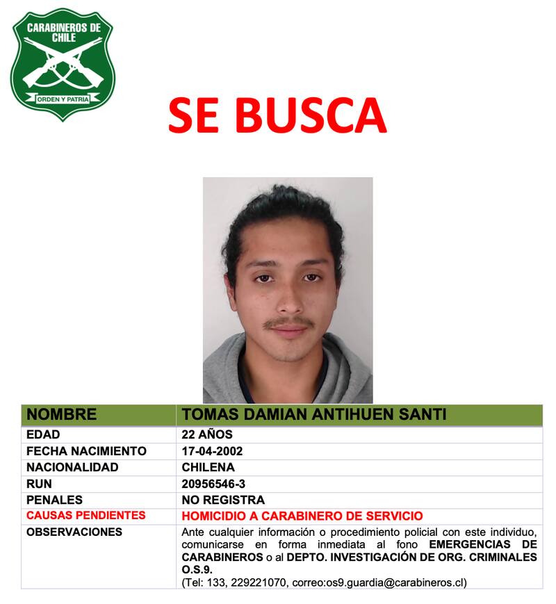 “El 27 de abril de este año fue un día que nos marcó para toda la vida. Tres de nuestros Carabineros fueron cruelmente asesinados. Desde el primer momento nuestros mejores equipos no han descansado para identificar a sus autores. Hoy, uno de ellos está prófugo, pero estamos desplegados en todos los lugares para dar con el paradero de este criminal. Tenemos habilitada la Comisaría Virtual, para quienes mantengan información y quieran entregarla de forma anónima”, señala una publicación de la policía uniformada en sus redes sociales.