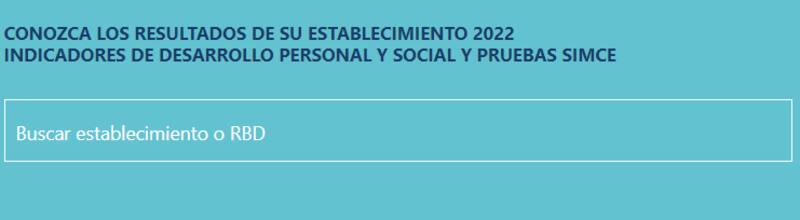 Al ingresar al sitio, el buscador se visualiza de manera inmediata en la parte superior. Su encabezado es “Conozca los resultados de su establecimiento 2022. Indicadores de desarrollo personal y social y pruebas Simce”, tal como se ve en la foto a continuación.