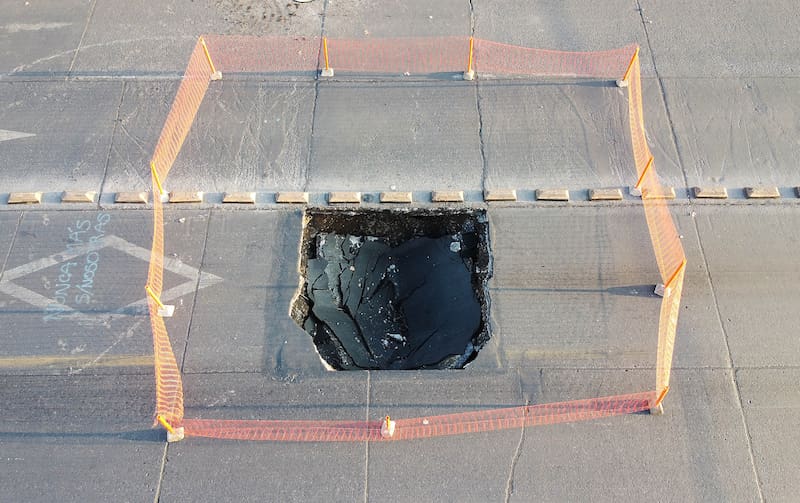 Según han informado autoridades, los trabajos para reparar este socavón se iniciarán a las 08:30 horas de este lunes. Ello debido a las dificultades que implica que debajo estén las obras de la Línea 1 de Metro.