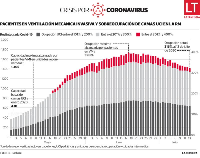 Pero los ojos de Sochimi están puestos principalmente en la Región Metropolitana, la zona más golpeada por la pandemia. Según la entidad, la capacidad basal de ventilación mecánica se cuadruplicó: los 438 cupos de abril crecieron a 1.743 en junio, cuando se registró un peak de casos, desbordando las UCI y recurriendo a las unidades reconvertidas. Así, la ocupación máxima alcanzada por pacientes fue de un 400% por sobre la capacidad basal.