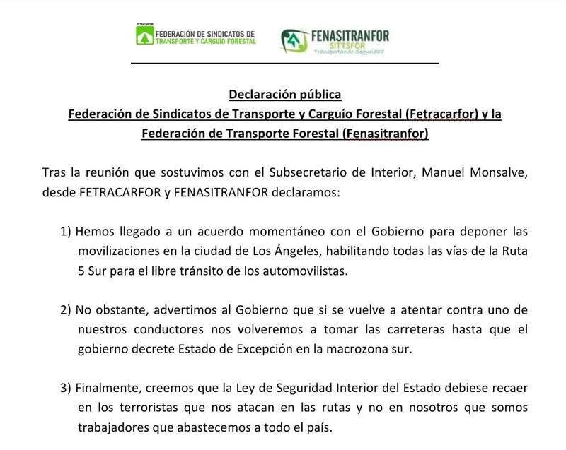 En tanto, desde la Federación de Sindicatos de Transporte y Carguío Forestal (Fetracarfor) y la Federación de Transporte Forestal (Fenasitranfor) presentaron una declaración pública, donde especifican que el acuerdo alcanzado con el gobierno es “momentáneo” y que consiste en habilitar las vías de la Ruta 5 sur para el libre tránsito de automóviles.