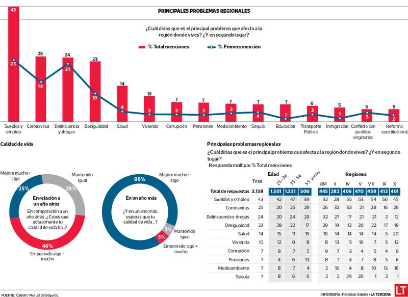 Y los resultados apuntan a una inquietud extendida en un punto: sueldos y empleo. El 43% de los consultados menciona este tema entre las dos principales preocupaciones de la región donde vive. Es la primera opción, con bastante distancia del segundo problema reportado, que es el coronavirus (25%), seguido de la delincuencia y las drogas (24%) y la desigualdad (23%).