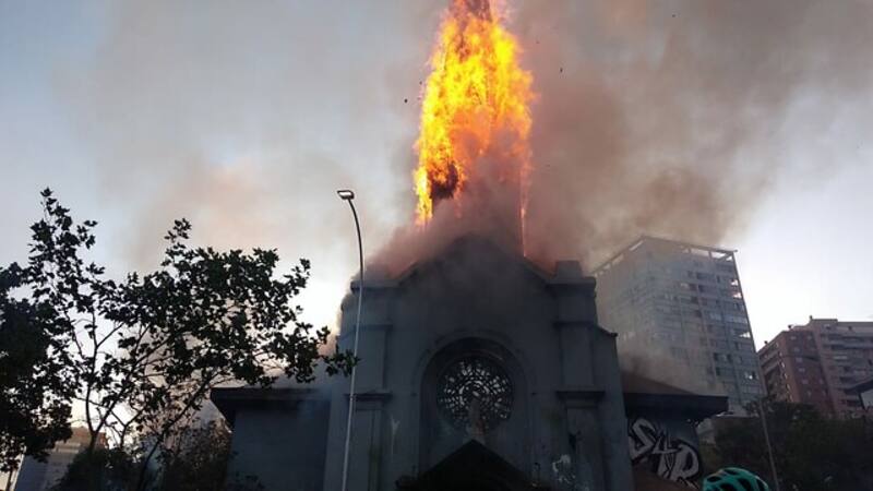 La iglesia ubicada en la intersección de avenida Vicuña Mackenna con la calle Barón de Coubertin, al sur de la Plaza Baquedano, fue atacada por desconocidos, que prendieron fuego en su ingreso.
