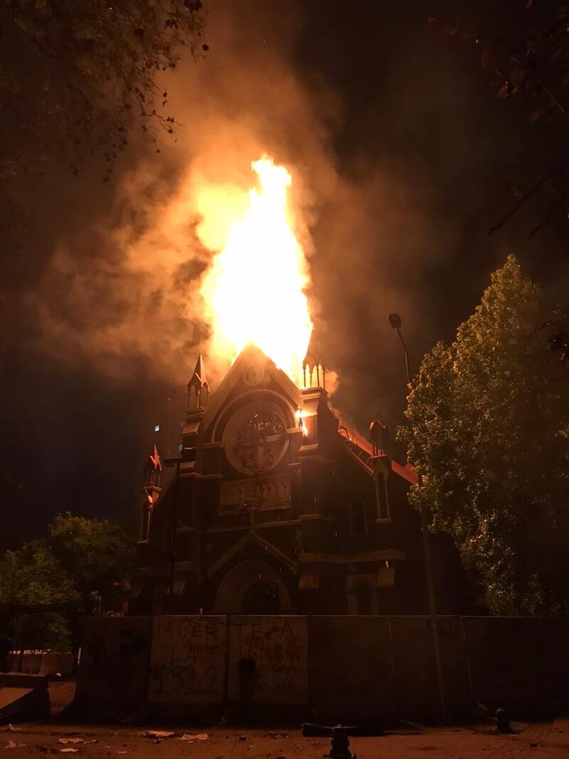 La cúpula del templo se desplomó por las llamas. Bomberos debió trabajar entre sujetos encapuchados que celebraron la caída de la estructura.