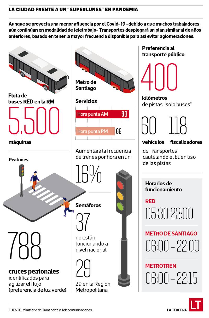 A fin de evitar aglomeraciones, desde el ministerio de Transportes y Telecomunicaciones señalaron que se tendrá a los distintos medio de transporte público con su máxima capacidad. Aún cuando, desde la cartera esperan que la ocupación y afluencia de pasajeros sea mucho menor a los tiempos previos a la pandemia.