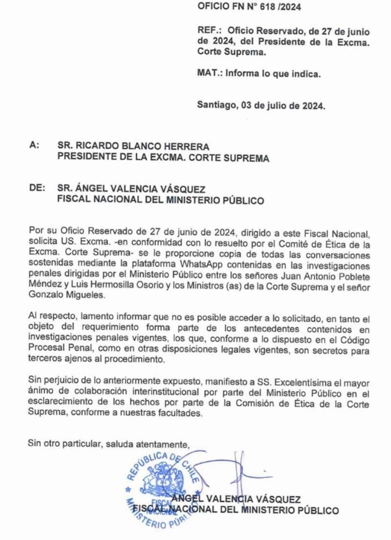 El martes 9, el prosecretario de la Corte Suprema, Marcelo Doering, tuvo la compleja misión de informar a cuatro de sus superiores que la Comisión de Ética había “dispuesto una investigación”. En el documento se explicitaba que era porque aparecían en conversaciones de WhatsApp de los casos judiciales que involucran a Luis Hermosilla y al exministro de la Corte de Santiago Juan Antonio Poblete.
