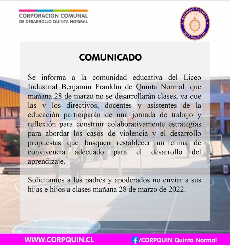 “Se informa a la comunidad educativa del Liceo Industrial Benjamín Franklin de Quinta Normal, que mañana 28 de marzo no se desarrollarán clases, ya que las y los directivos, docentes y asistentes de la educación participarán de una jornada de trabajo y reflexión para construir colaborativamente estrategias para abordar los casos de violencia y el desarrollo propuestas que busquen restablecer un clima de convivencia adecuado para el desarrollo del aprendizaje”, expresaron en un comunicado difundido el domingo, haciendo el llamado a padres y apoderados a no enviar a sus hijas e hijos a clases.