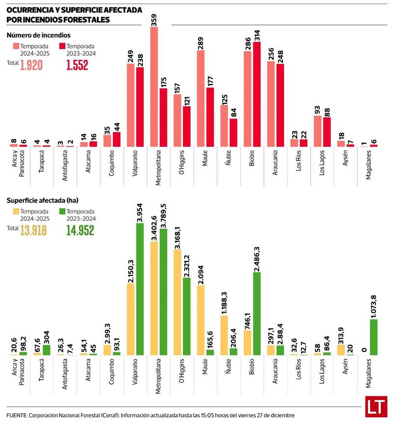 Con la llegada del verano hace unos días el panorama no parece atenuarse. En lo que va de la temporada de incendios forestales 2024-2025 (que comenzó el 1 de julio de este año y concluye el 31 de junio del siguiente), según la información de Conaf actualizada a las 15:05 del viernes 27 de diciembre, se han registrado 1.920 incendios forestales a nivel nacional, siendo la Región Metropolitana (RM) la zona con mayor presencia de estos (359). Le siguen Maule (289), Biobío (286), La Araucanía (256) y Valparaíso (249). Acorde a esos datos, la temporada de incendios 2024-2025 presenta una mayor cantidad de siniestros que la temporada 2023-2024, periodo en que se registraban 1.552 incendios forestales hasta la fecha, versus los 1.920 de ahora. Es decir, aumentó 24%.