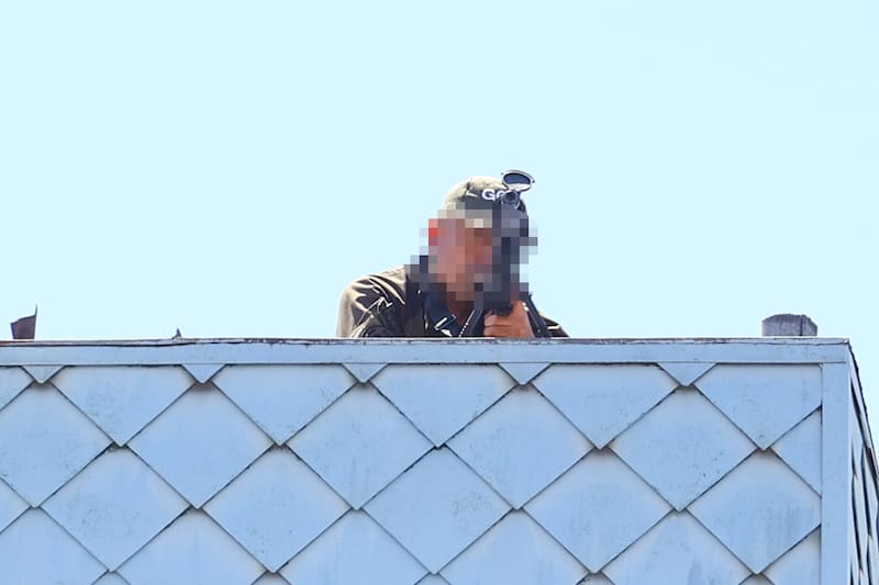 Un francotirador de la policía uniformada se instaló en la azotea de un edificio frente a la sucursal, en el que funciona un preuniversitario. Allí se mantuvo con su fusil mientras observaba el desarrollo de la situación.