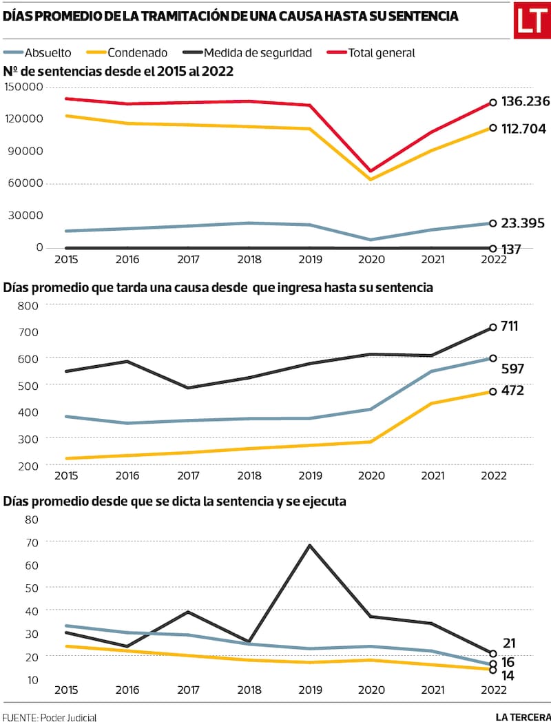 Esto es sólo un ejemplo de la actual realidad de los tribunales. Según datos del Poder Judicial, los tiempos para lograr una sentencia, ya sea condenatoria o de absolución, han aumentado considerablemente. Esto, porque el período desde que ingresa una causa hasta que se logra una condena, ha pasado de 222 días que tardaba en promedio el 2015, a 472 el año pasado. Aquello refleja un aumento de un 112,6% en siete años (ver infografía).