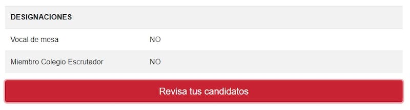 También se informa si se fue seleccionado para trabajar como vocal de mesa durante las jornadas de elecciones. Cabe recordar que las personas que sean llamadas a ser vocal de mesa que no se presenten se exponen a una sanción que va de 2 a 8 UTM. La multa es de entre $133.122 y $532.488 a beneficio municipal.