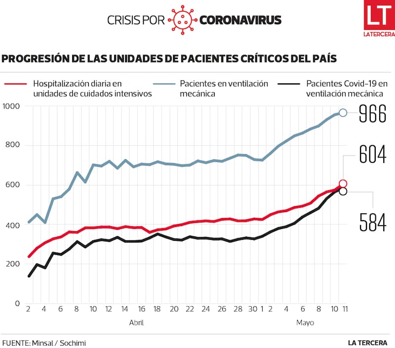 Así, mientras en la segunda quincena de abril la hospitalización diaria de pacientes en unidades de cuidados intensivos variaba entre 300 y 400 personas, ayer alcanzó las 604, según el reporte del gobierno. Asimismo, de acuerdo al informe de la Sociedad de Medicina Intensiva (Sochimi), mientras a fines de abril los enfermos de Covid-19 conectados a ventilación mecánica bordeaban los 300 casos, el día de ayer el balance cerró en 584.