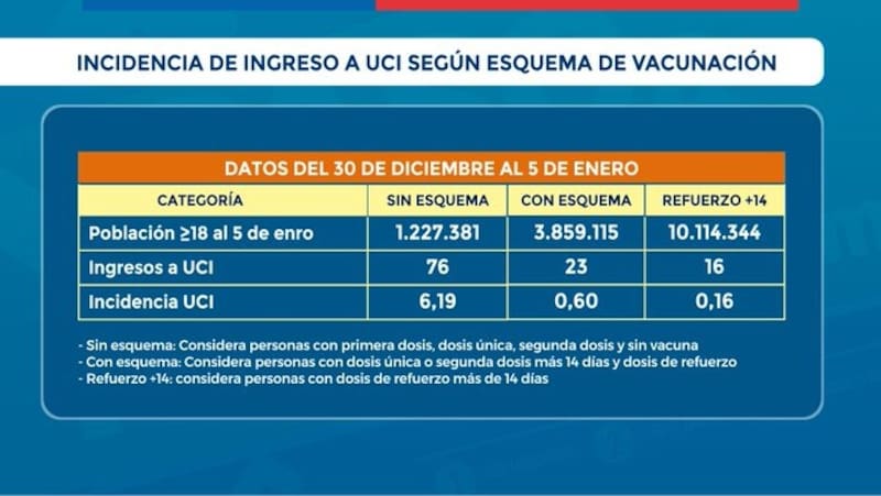El subsecretario de Redes Asistenciales, Alberto Dougnac, por otro lado, volvió a destacar las cifras de incidencia de ingresos a camas críticas por parte de las personas sin esquema de vacunación completo, versus las que ya tenían su dosis de refuerzo.