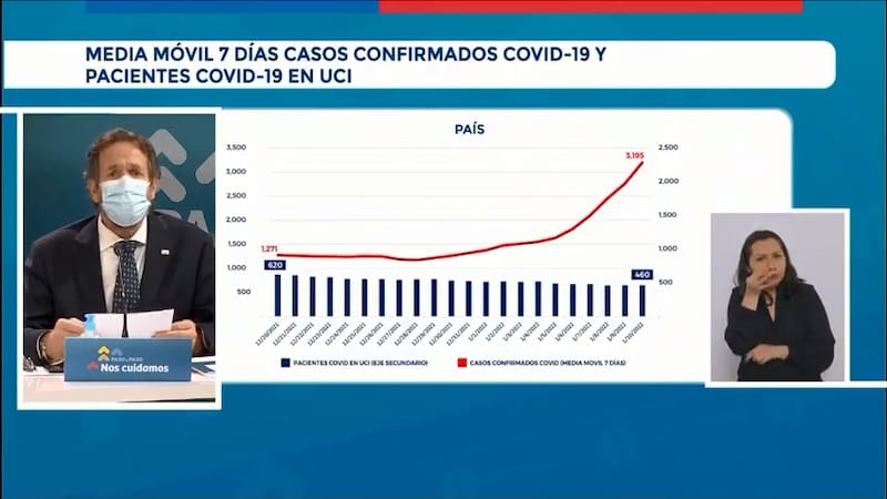 “Luego de una caída sostenida del número de pacientes contagiados, que se inició a mediados de noviembre, en las últimas semanas el promedio de casos diarios ha tenido un evidente aumento. Pasamos desde los 1.169 promedio registrados al 27 de diciembre a 3.195 registrados el día de hoy. Este aumento cercano al 170% es motivo de gran preocupación y nos mantiene en constante evaluación de las medidas que debemos tomar sobre el manejo de la pandemia. Ya que podría impactar de forma directa en el número de pacientes que se hospitalizan a consecuencia de esta enfermedad”, aseguró el subsecretario de Redes Asistenciales, Alberto Dougnac.